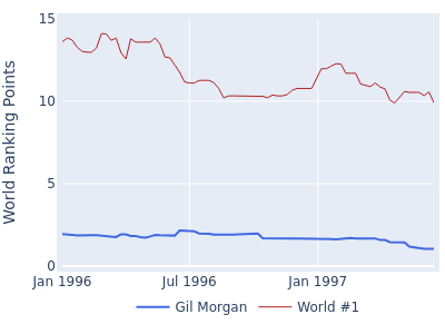 Gil Morgan's peak world ranking occured on June 17, 1996, when he was ranked #76 with 2.160 world ranking points.