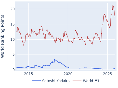 Satoshi Kodaira's peak world ranking occured on April 9, 2018, when he was ranked #27 with 3.466 world ranking points.