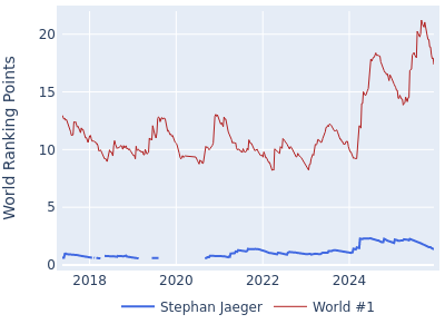 Stephan Jaeger's peak world ranking occured on January 20, 2025, when he was ranked #40 with 2.206 world ranking points.